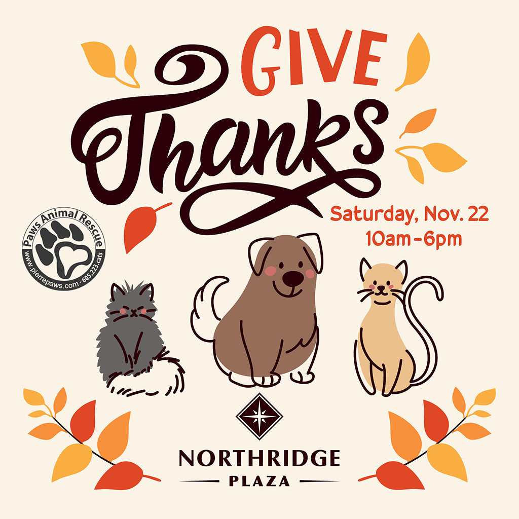 The Give Thanks vendor event (10am–6pm) and 🐶 PAWliday Festival (11am–3pm) is happening at Northridge Plaza on Saturday, November 22nd! 🍪 Be sure to stock up on PAWS signature homemade dog treats!